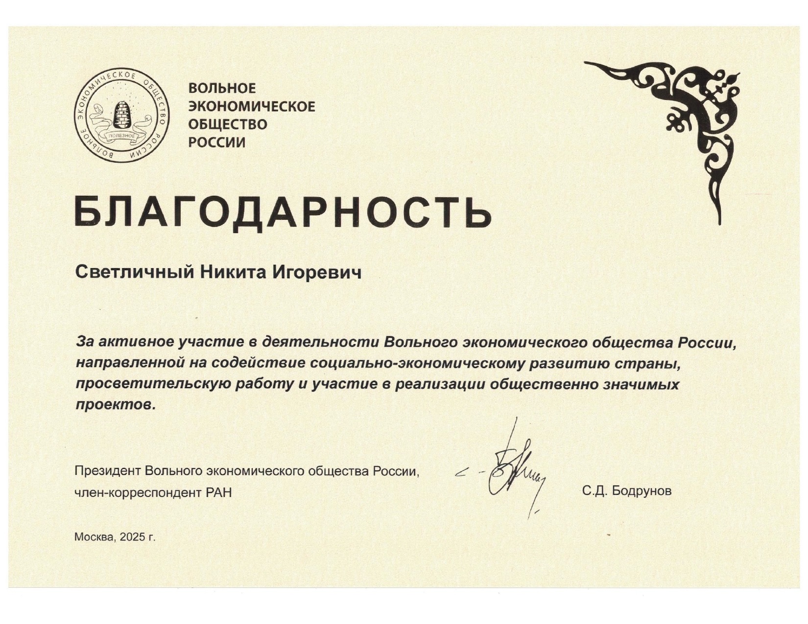 А ведущий специалист КРАГСиУ Никита Светличный отмечен Благодарностью ВЭО России.