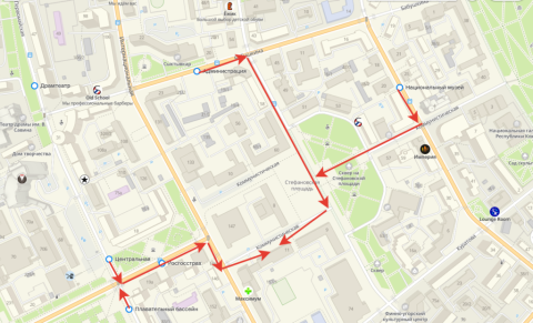 | Маршруты общественного транспорта | Автобус: 1, 3, 5 (от остановки общественного транспорта «Национальный музей») Автобус: 5, 6, 17 (от остановки общественного транспорта «Администрация») Автобус: 5, 6, 17 (от остановки общественного транспорта «Росгосстрах») Автобус: 15, 18, 19 (от остановки общественного транспорта «Центральная») Автобус: 19, 28, 101 (от остановки общественного транспорта «Плавательный бассейн») |
